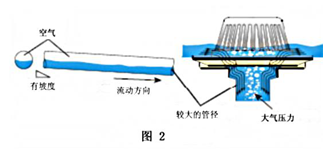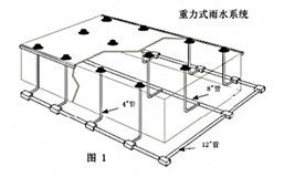 傳統(tǒng)重力式雨水系統(tǒng),是由雨水斗和垂直落水管網(wǎng)組成的。雨水斗收集的雨水通過(guò)垂直落水管排至地下排水管網(wǎng)中。為保證雨水順利流至排水管網(wǎng),這種傳統(tǒng)重力式雨水系統(tǒng)結(jié)構(gòu)所需的排水管管徑往往比較大,且與其相連的地下管網(wǎng)的管徑也比較大。這主要是由于系統(tǒng)內(nèi)處于恒定的大氣壓力(見圖2) ,雨水只靠垂直管道水落差產(chǎn)生的動(dòng)力和水平管道的坡度流動(dòng)。順著垂直落水管像瀑布一樣下流的雨水在水平管道內(nèi)產(chǎn)生翻騰(見圖2) ,這樣即便是在最大降雨量的情況下,水平管內(nèi)也有超過(guò)橫截面積1/2的空間充滿了空氣。也就是說(shuō),若能排除空氣,相同的水量只需傳統(tǒng)重力式雨水系統(tǒng)1/2的管道截面積就能排出。由于傳統(tǒng)重力式雨水系統(tǒng)無(wú)法除去空氣,提高其排水能力受到很大的限制。加之其流速低,雨水中夾帶的固體顆粒物容易在水平管道中沉積。這種雨水系統(tǒng)的低效率是由其結(jié)構(gòu)造成的,特別是安裝在大跨度的建筑屋面上,上述的缺陷顯得更為突出。